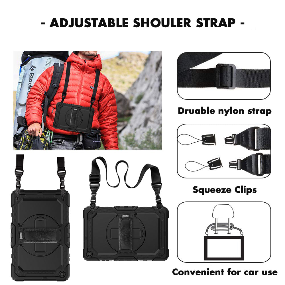 - Rotatable Hand strap& Detachable shoulder strap A variety of convenient holding and carrying designs make your tablet easy to carry. Use the hand strap to prevent the tablet from falling, and use the shoulder strap to release your hands.