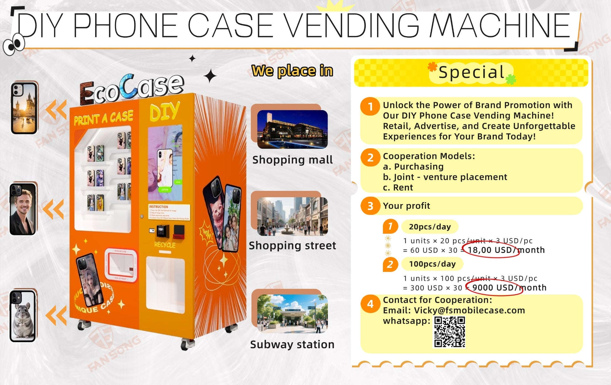 11. Not only can we sell you this machine and phone cases, but we can also support your local partners in placing this machine in shopping malls, shopping centers, and subway stations, help you operate it, and share the profits with you. This is the simplest new business model for you.and we support your efforts in developing distributors and agents to promote your brand world wide .